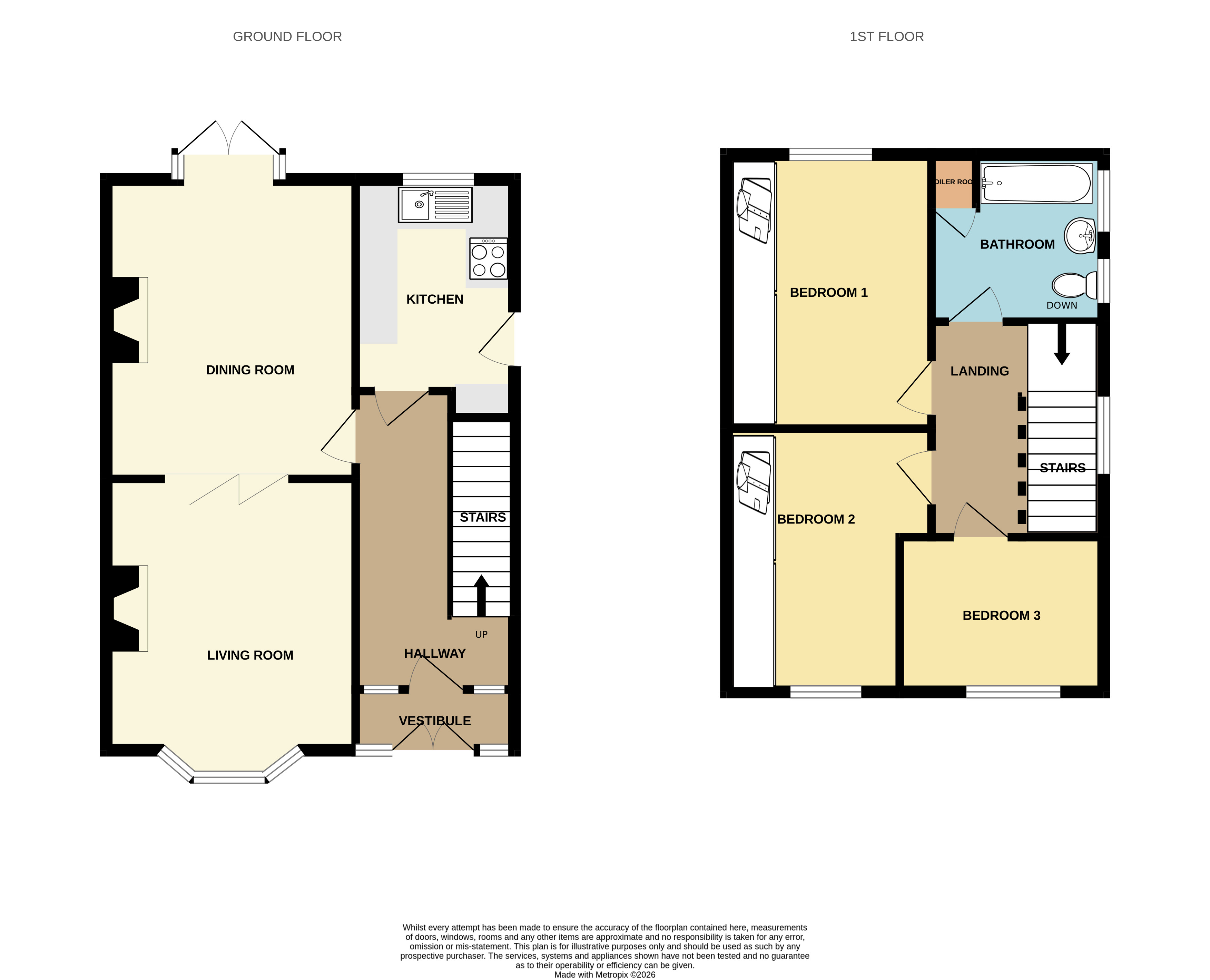 The ground floor offers two spacious and versatile reception rooms. The front living room is bright and inviting, enhanced by a large bay window and feature fireplace. A second reception room, ideal as a dining room or additional lounge, features its own fireplace and double patio doors opening onto a well-designed, low maintenance garden. Folding doors between the rooms allow you to easily switch between open-plan living or two separate rooms.