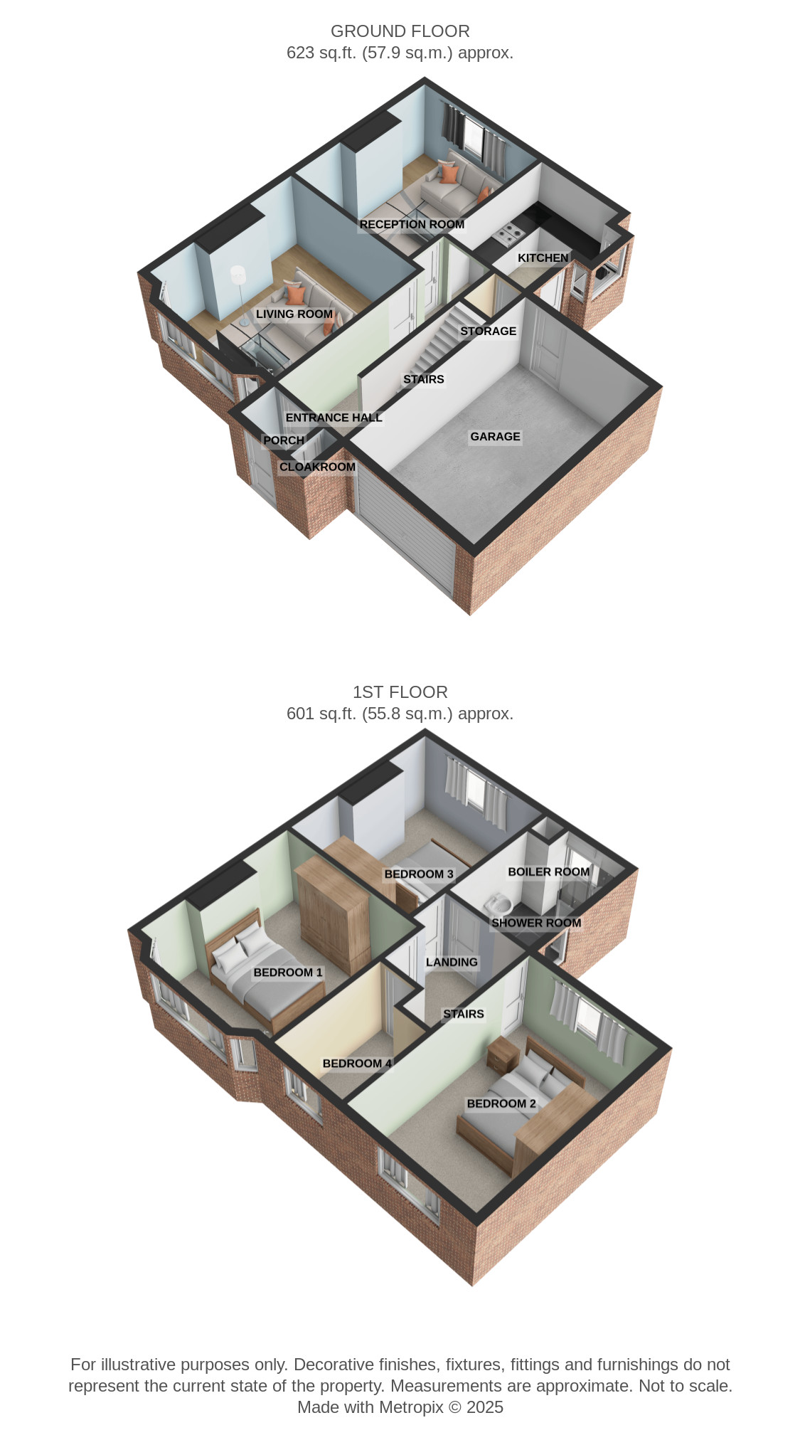 Outside, the rear garden is a real highlight of this home. Beautifully landscaped and maintained, it features a large patio area perfect for entertaining or relaxing and a wide, lush lawn bordered by mature shrubs and flower beds. At the end of the garden, there is a garden shed in excellent condition. The front garden is equally well presented, with a neatly kept lawn, well-tended flower beds and a gated driveway with parking for two cars. To the side of the property sits a single brick garage, currently used for storage but offering potential for conversion into another living area or office, subject to the necessary permissions. The property is not overlooked to the rear and enjoys views of green space playing fields at the front.