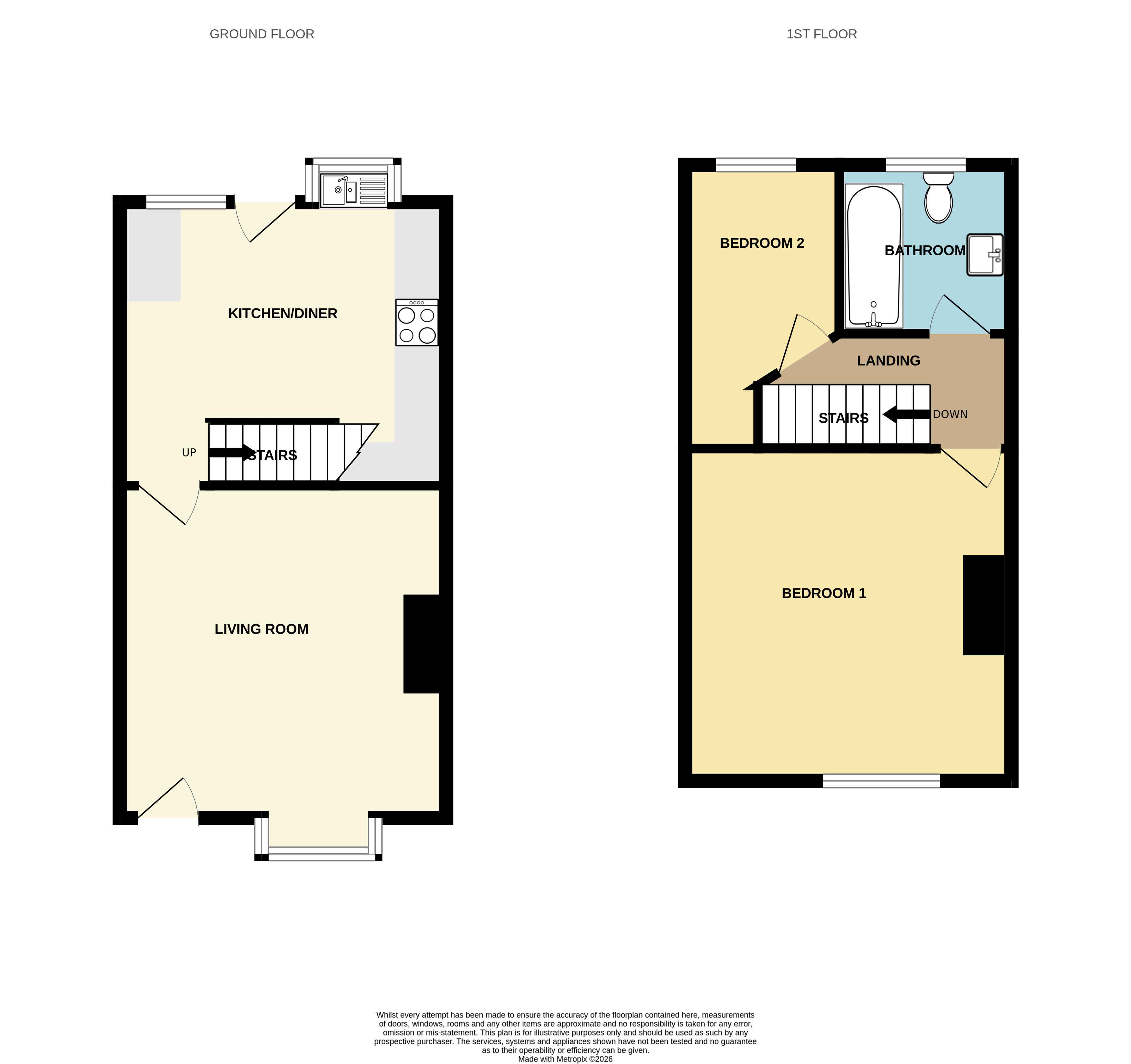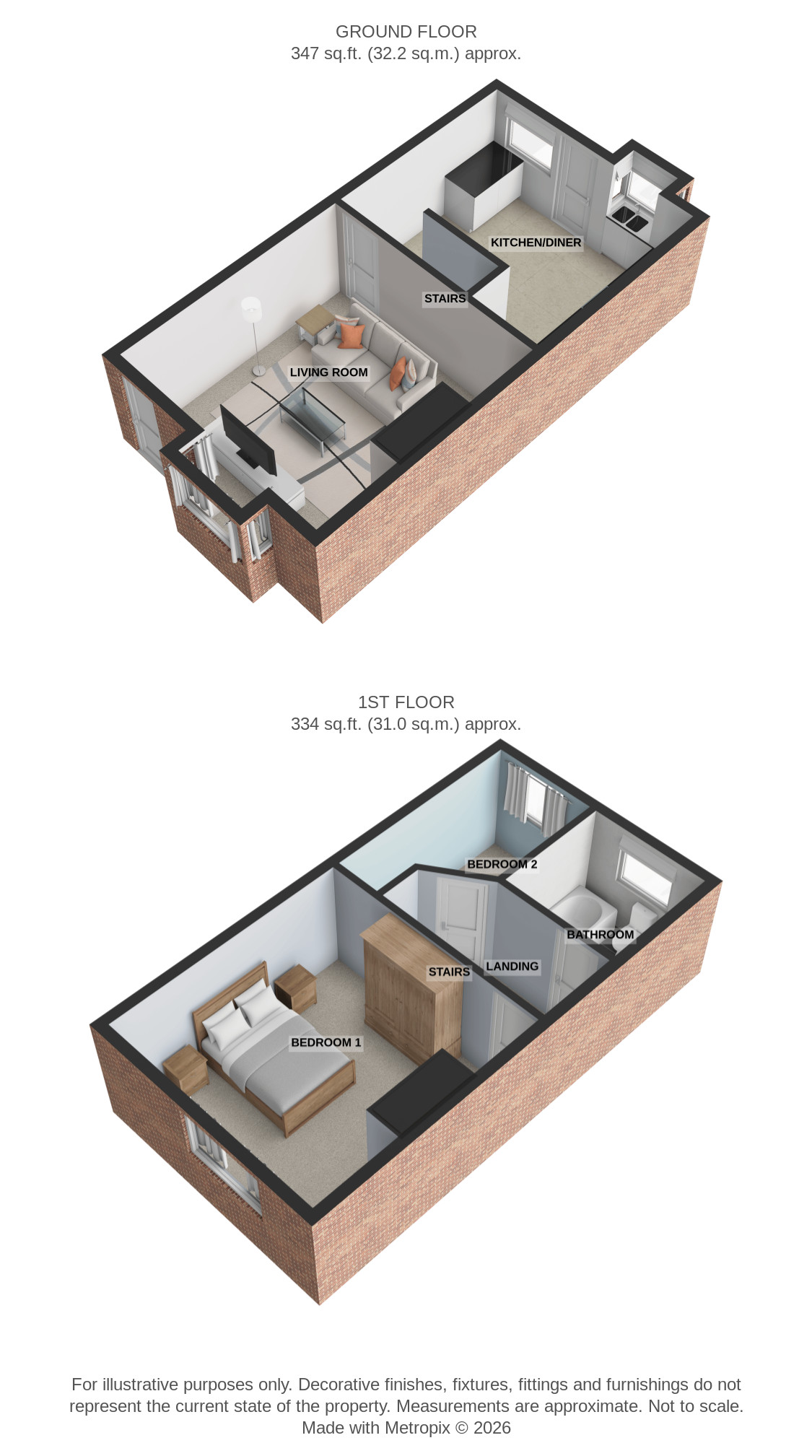 To the first floor, the property offers two generously sized bedrooms. The main bedroom, located at the front of the property, is a large double room and benefits from fitted wardrobes, providing excellent storage while still allowing space for additional bedroom furniture. The second bedroom is a good-sized single room, ideal for a child’s bedroom, guest room or home office, with plenty of space for storage solutions.