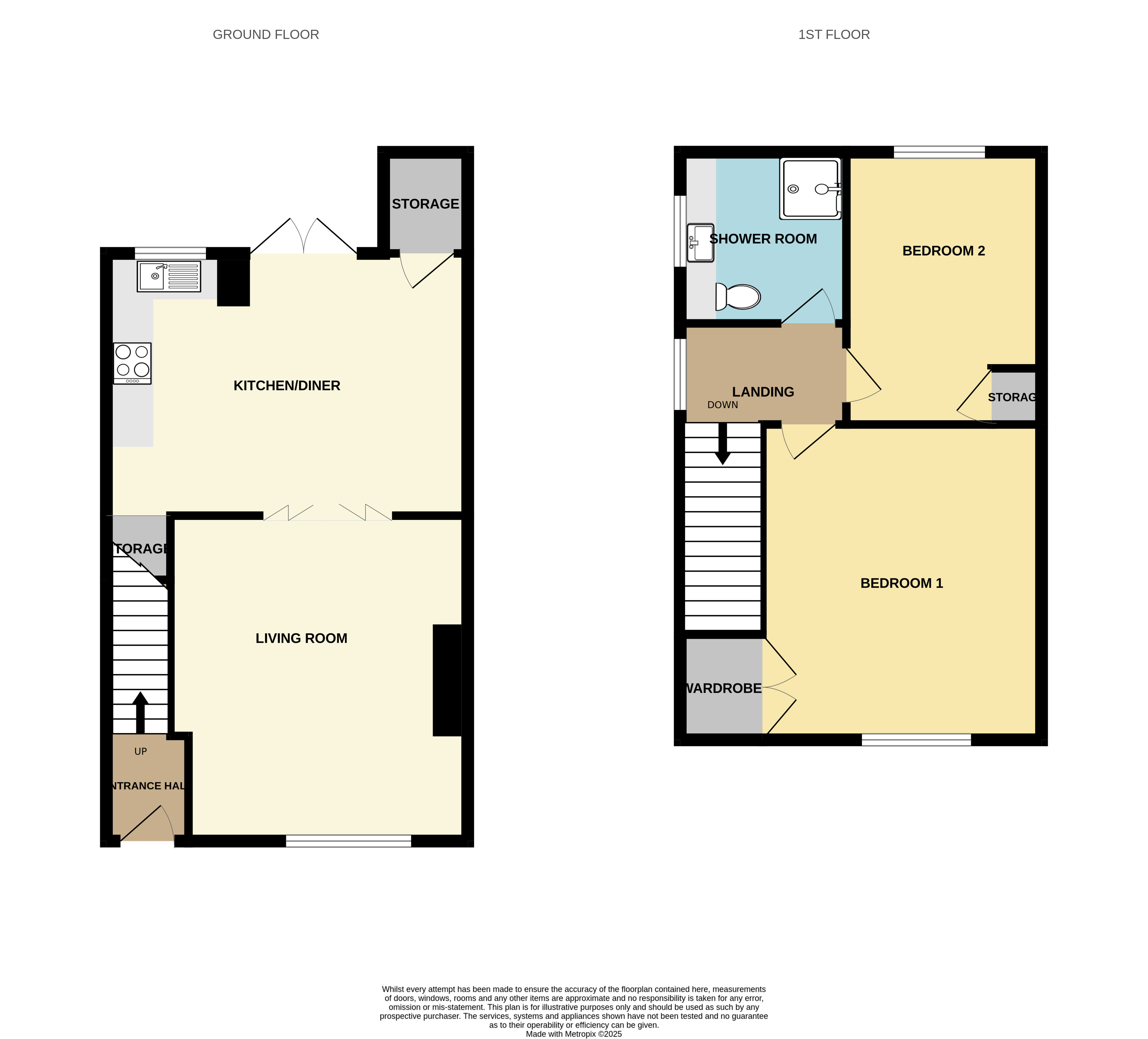 Upstairs, the property offers two double bedrooms, both well-proportioned and neutrally decorated, perfect for putting your own stamp on. The main bedroom benefits from fitted wardrobes, providing excellent storage without compromising on space. The modern shower room is a generous size and features a walk-in shower with glass screen, toilet, sink and fitted storage units for a sleek, contemporary look.